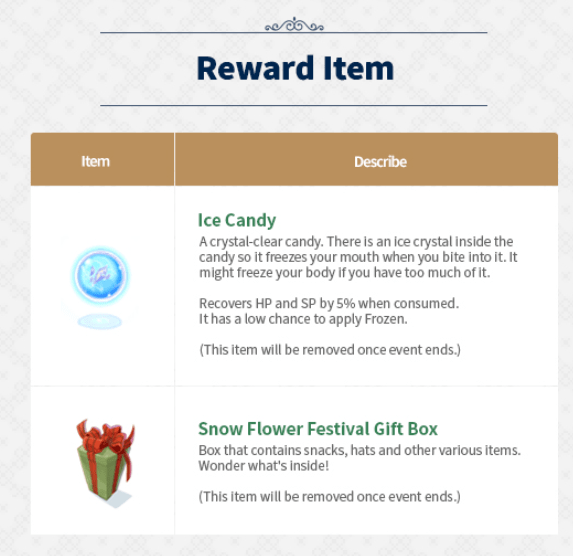 Talk to Snow in Aldebaran to trade in Ice candy for Snow Flower festival gift box.