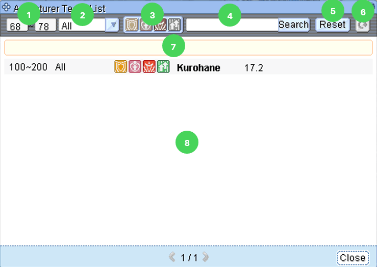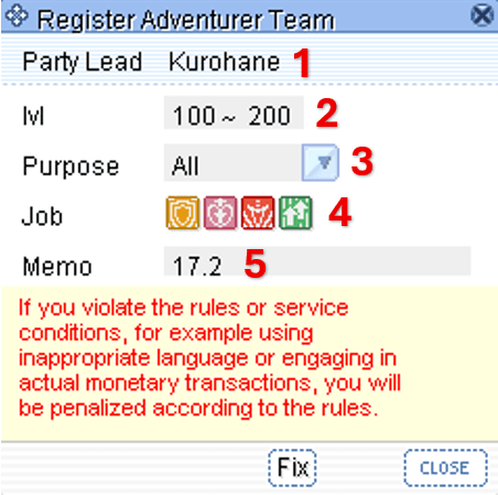 1. Party Leader: The name of the player who registered the recruitment message display on the Adventurer Brokerage Agency. You cannot change this portion.