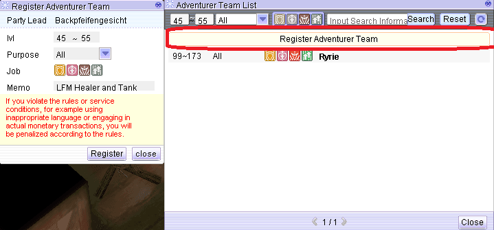 7. Register Adventurer Brokerage Agency’s: Button to register “Find Party” with Adventurer Brokerage Agency.