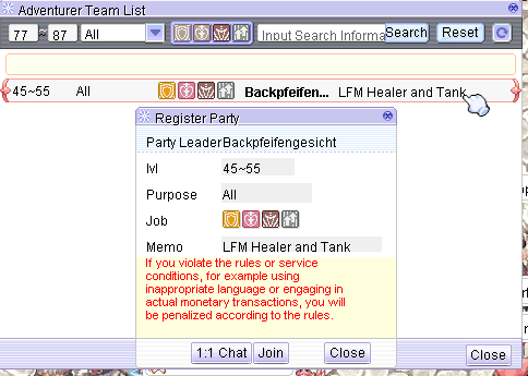 3. Once you select a party, a new window will appear similar to the party registration UI. This time, you will see options for 1:1 Chat and Join.