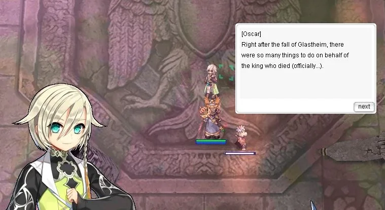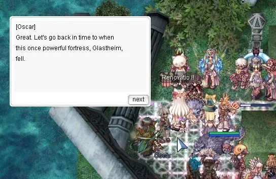 1. Find and speak to Oscar at /navi glast_01 241/290. He introduces himself as a Dimension-Traveler, and wishes to show you his favorite point in time which happened in Glast Heim. Create a solo party, and then talk to him again to generate and enter the Pre-Quest instance.