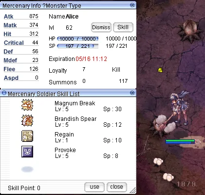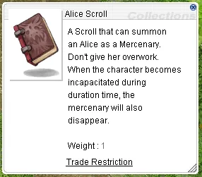 - Alice Mercenary Scrolls (via New User Box) summon an Alice companion to fight alongside you. She can use AoE skills such as Brandish Spear and Magnum Break that can kill multiple monsters at once, making early leveling effective. If you wish for Alice to automatically attack and use skills, consider downloading and setting up AzzyAI in the AI>USER_AI Folder.