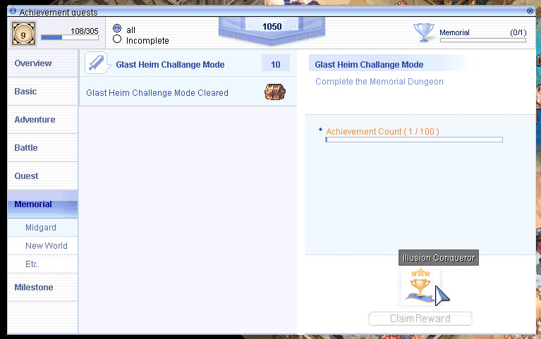 Players may also view their clear count progress through the Achievements Window. Find the Memorial tab at the left column of the window to view it.