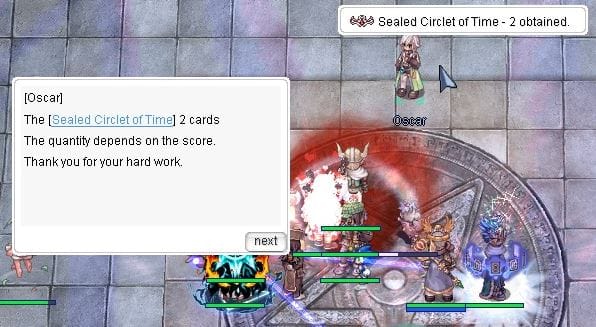 6. Defeating either boss will spawn a treasure chest in the middle of the BFA. Interacting with it will drop various items on the floor, with their quantities scaling with DLv. Oscar will also appear after eliminating the boss, and will reward each member with Sealed Circlets of Time depending on their performance. Once finished, speak to him again to leave the instance.
