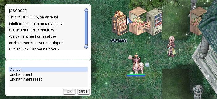 Temporal Circlets that are crafted from the HUGINN2001 vending machine can be enchanted through this OSC0005 vending machine. Enchants are random, starting from 4th slot going to 3rd slot, but have a guaranteed 100% success rate. Players who are not satisfied with their enchants may choose to reset them at the cost of 2 Nyangvine Fruits (100% success chance) or 500,000z Zeny (70% success chance, item is broken and lost upon failed attempt). Refer to the table below for the enchant cost per slot and which enchants can be obtained: