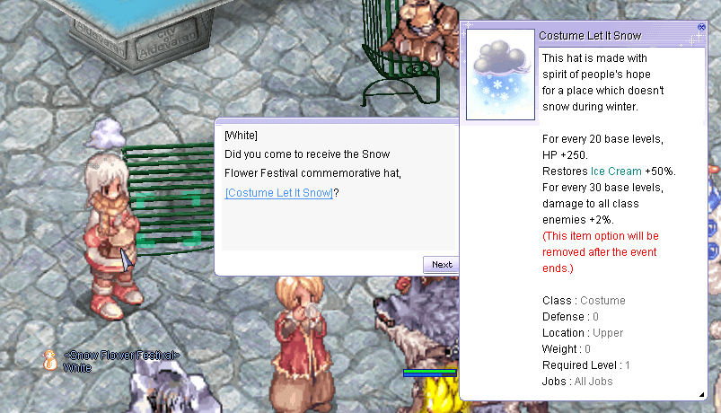 ![]() Festival PR Agent | Meet the Snow Flower Festival Ambassadors in the major cities. They’ll tell you all about the festival and give you a free ride to Al De Baran, where the festivities are in full swing! Prontera 164/173 Payon 192/99 Alberta 125/73 Geffen 129/57 Morocc 168/87 Eden Group 40/20 Yuno 148/181 Rachel 111/134 |