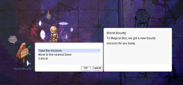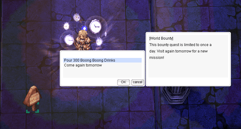 Offer one Boong Boong Drink to Magical Boy to teleport to a World Bounty Map according to your level.