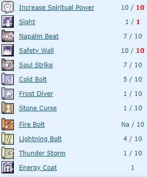 | Inflicts Neutral property magic damage to all enemies in a 5×5 area around the targeted location. | Since the rework, this is one of your strongest spells. Max this ASAP. It has a cooldown, but the damage is worth it. It is also neutral so it works for most mobs except ghost and holy 4. | |